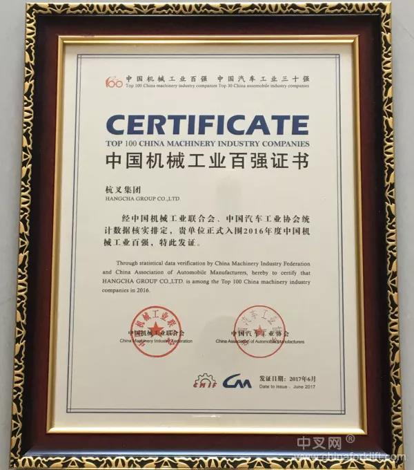 杭叉集团荣获2016年度中国机械工业百强企业的称号