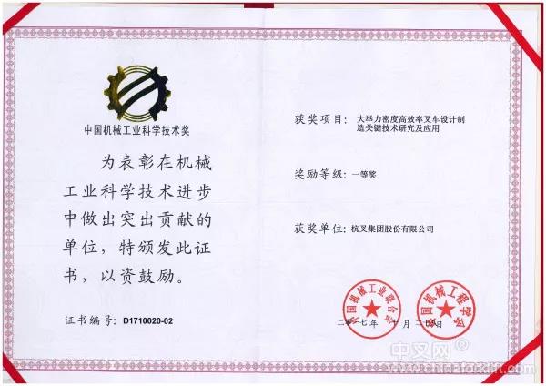 杭叉集团荣获2017年中国机械工业科学技术奖一等奖