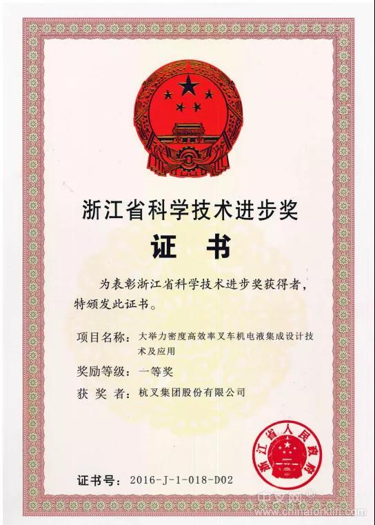杭叉集团荣获浙江省科技进步一等奖