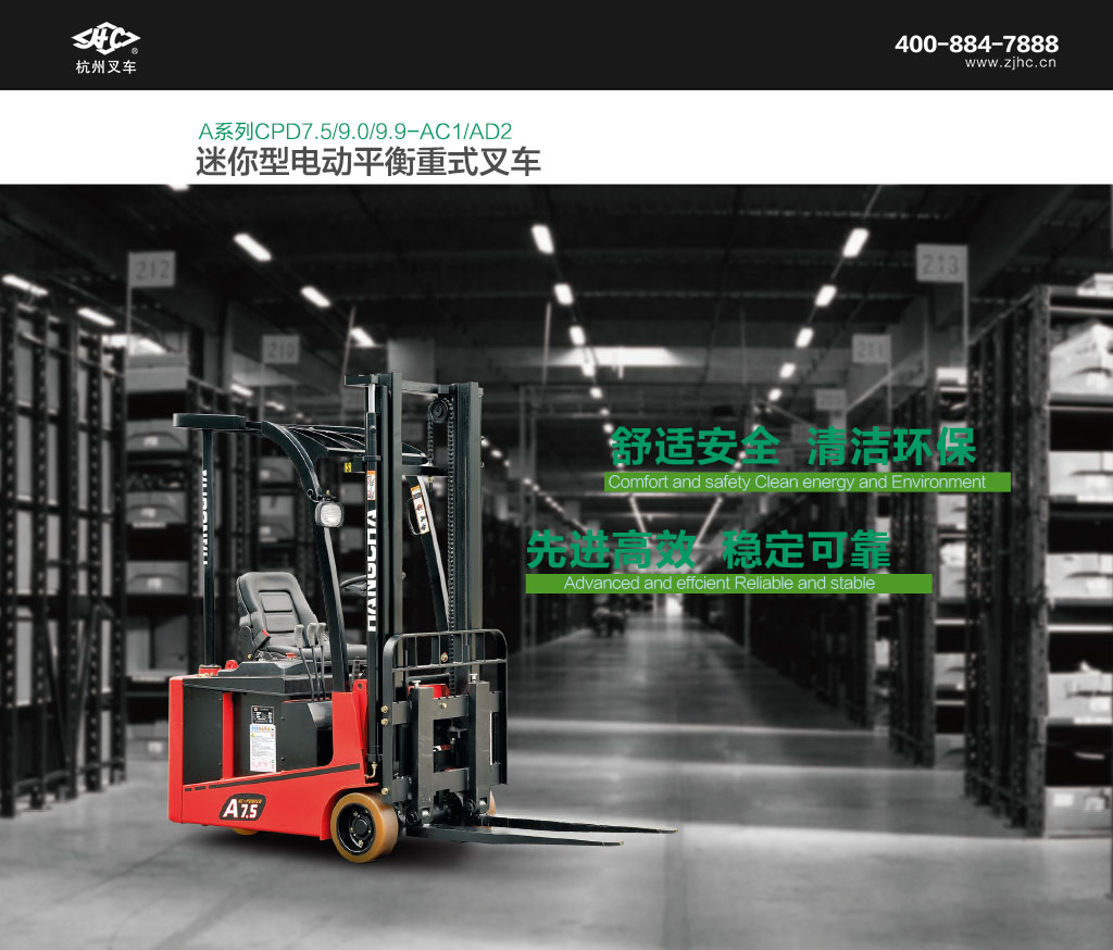 ● 0.75-0.99t Mini迷你电叉——尺寸小、高效率的物流解决方案。A系列0.75t/0.9t/0.99t迷你电叉,是杭叉最小的电动平衡重式叉车。特别适合于轻工、电子,纺织等行业,应用于楼层之间/电梯上下搬运工作。自重轻,可连同货物进入普通货梯,转弯半径1.2米左右,可在狭小的空间内搬运、堆垛、转弯,是国内最小的电动平衡重式叉车。