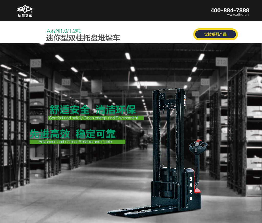 ● A系列迷你型双柱托盘堆垛车是杭叉针对仓储物流应用全新开发的新一代产品,采用最新的永磁驱动技术,性能先进,操作舒适,安全可靠,使用维护成本低,是仓库、超市、车间、家庭内装卸和搬运托盘化货物的理想工具。