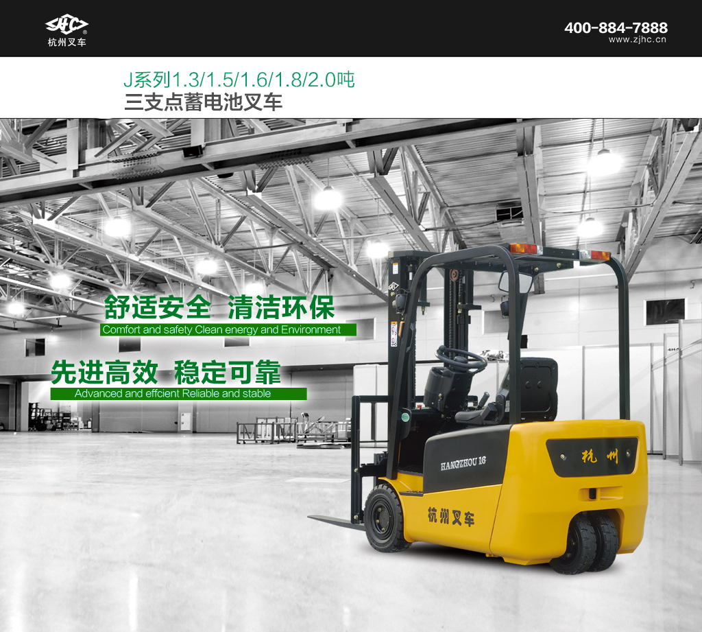 ● J系列1.3-2.0t三支点叉车适合于狭窄通道和有限空间内的作业,具有高起升、高承载能力,转弯半径小,是仓库、超市、车间内装卸和堆垛的理想工具。