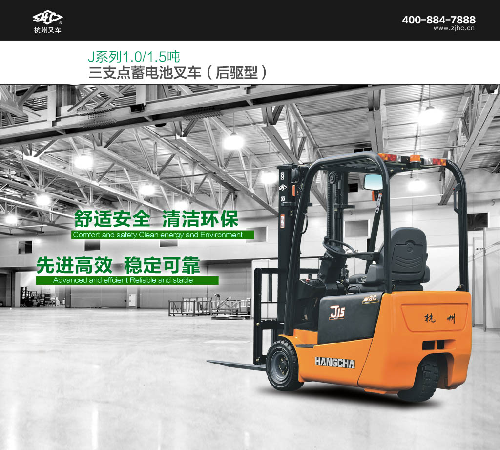●J系列1.0-1.5t后驱三支点叉车适合于狭窄通道和有限空间内的作业,转弯半径小,是仓库、超市、车间内装卸和堆垛的理想工具。