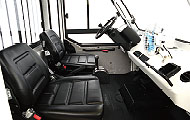 ● 人机交互系统采用新型数字化多功能仪表盘、液晶显示,组合翘板开关,标配车速里程表,对车辆运行情况一目了然,简洁、可靠、直观。 ● 采用横置油缸转向桥、全液压转向器等叉车专用技术。转向操纵力小于10N。可选同步转向系统,有路感、自动回正功能,稳定性好,特别适用于机场等中长距离路面。 ● 可选自动换档系统(液力传动),操作更轻松。 ● 先进的底盘弹性悬挂技术,长轴距、大柔度设计,车辆平顺性好。 ● 高视野、整体式全浮驾驶室,与车身柔性联接,密封性好,隔音、隔振、隔热等,提高驾驶员舒适性和操作方便性。