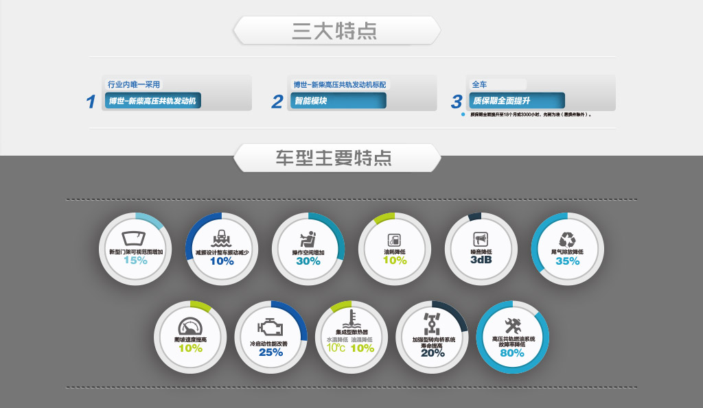 ●标配博世-新柴高压共轨电控发动机,采用高压多次喷射技术,动力输出强、烟度排放更低 、冷起动性能更好;能耗节省10%。