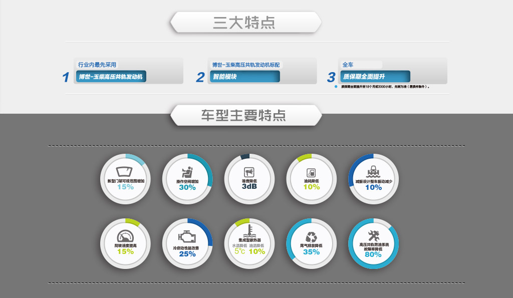 ● 标配博世-玉柴高压共轨电控发动机,采用高压多次喷射技术,动力输出强、烟度排放更低 、冷起动性能更好;能耗节省10%。