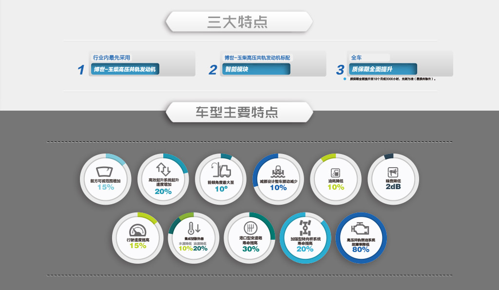 ● 标配博世-玉柴高压共轨电控发动机,采用高压多次喷射技术,动力输出强、烟度排放更低 、冷起动性能更好;能耗节省10%。